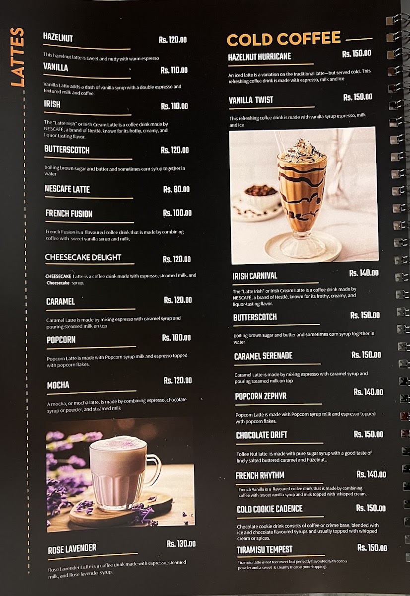 - Lattes: A range of flavored lattes including Hazelnut, Vanilla, Irish, Butterscotch, Nescafe Latte, French Fusion, Cheesecake Delight, Caramel, Popcorn, Mocha, and Rose Lavender.