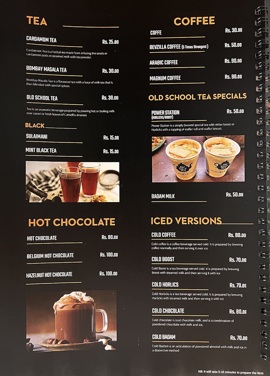 The menu at OLD SCHOOL TEA CHENGANNUR offers a variety of beverages and light food options suitable for different times of the day such as breakfast, coffee breaks, or casual light meals. It is organized mainly into categories of hot and cold drinks, along with a selection of snacks and bites.
